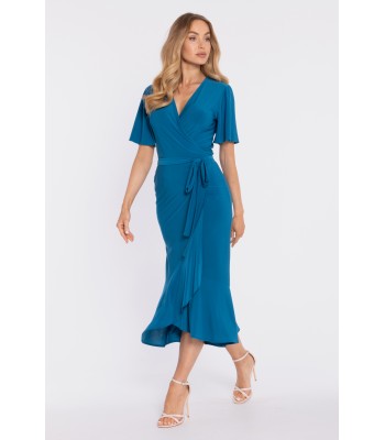 M912 Kopertowa sukienka midi z falbaną i marszczeniem - turkusowa