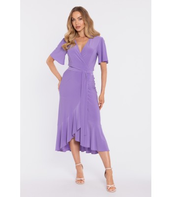 M912 Kopertowa sukienka midi z falbaną i marszczeniem - jasny fiolet
