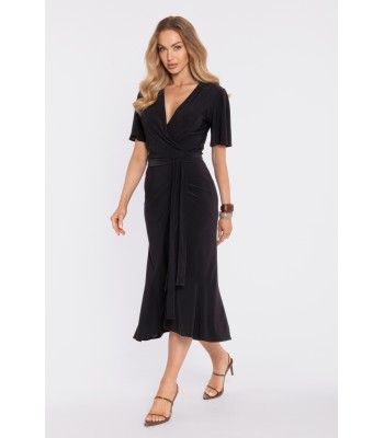 M912 Kopertowa sukienka midi z falbaną i marszczeniem - czarna