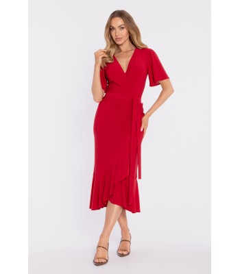 M912 Kopertowa sukienka midi z falbaną i marszczeniem - czerwona